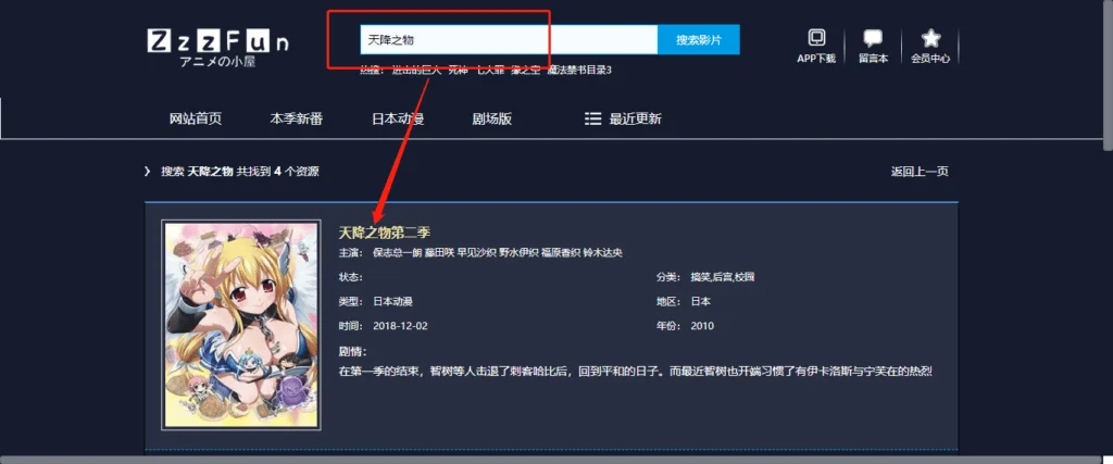 然后点击网站:http://www.zzzfun.com/(也可以将该网址复制粘贴到 Google 浏览器后进入),首页搜索【天降之物】即可追番。